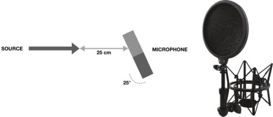 Per diminuire l’incidenza delle consonanti detonanti e soffianti, sarà spesso opportuno far assumere un’opportuna inclinazione al microfono. In tal caso la capsula dovrebbe essere posizionata all’incirca all’altezza del naso ed indirizzata verso la bocca, con un inclinazione di circa 20° o 30° (vedasi figura che segue). Tale inclinazione è molto consigliabile in caso di microfono molto ravvicinato (10-20 cm) mentre perderebbe di significato nell’allontanarsi da esso (a 30 cm e oltre).