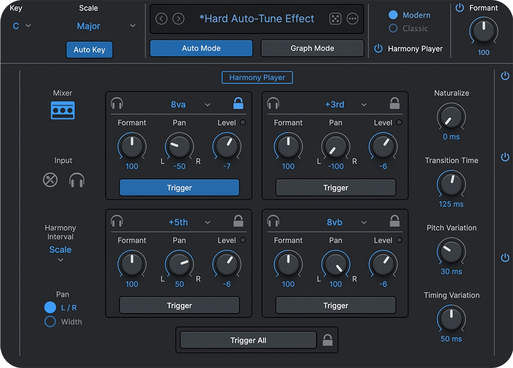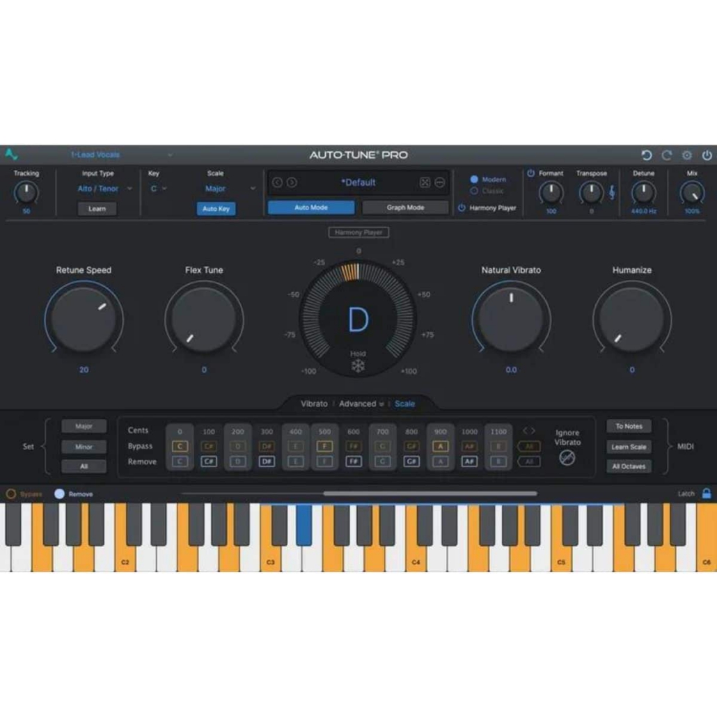 Auto-Tune Pro 11 include due ambienti distinti: la modalità Auto, per una correzione in tempo reale fluida e precisa, e la Graph Mode, che consente interventi chirurgici su ogni singola nota, con linee, curve e note disegnabili a mano. La nuova funzione Harmony Player permette di generare fino a 4 armonizzazioni vocali controllabili via MIDI, arricchendo le possibilità creative.